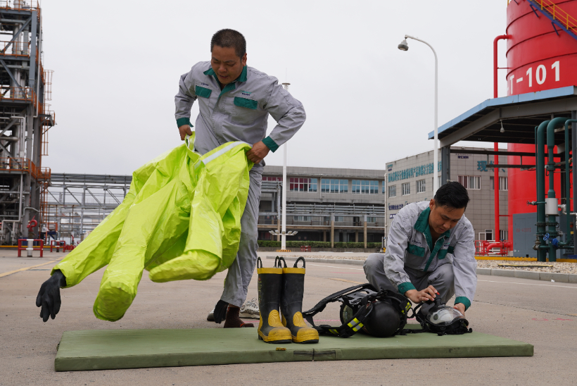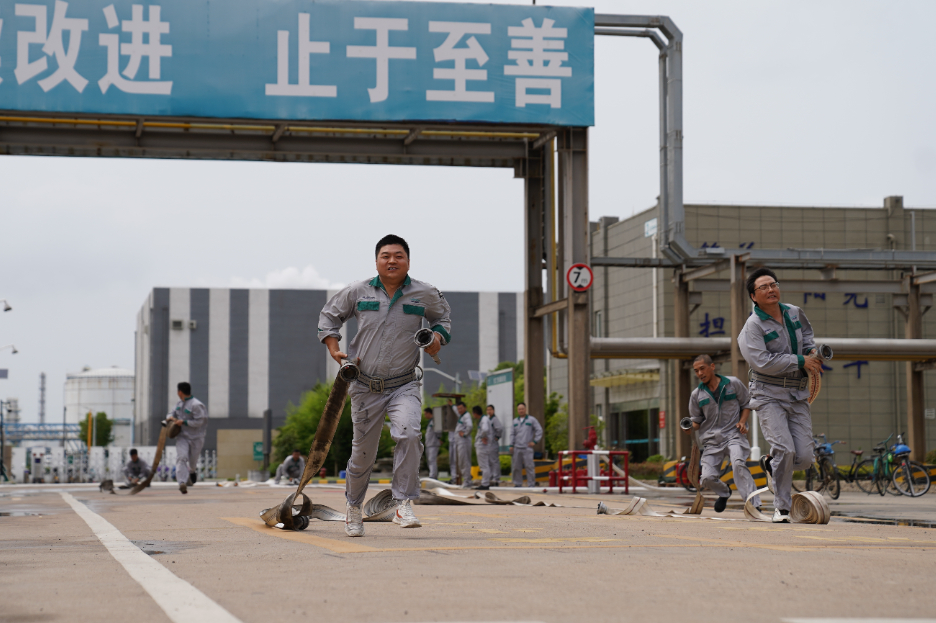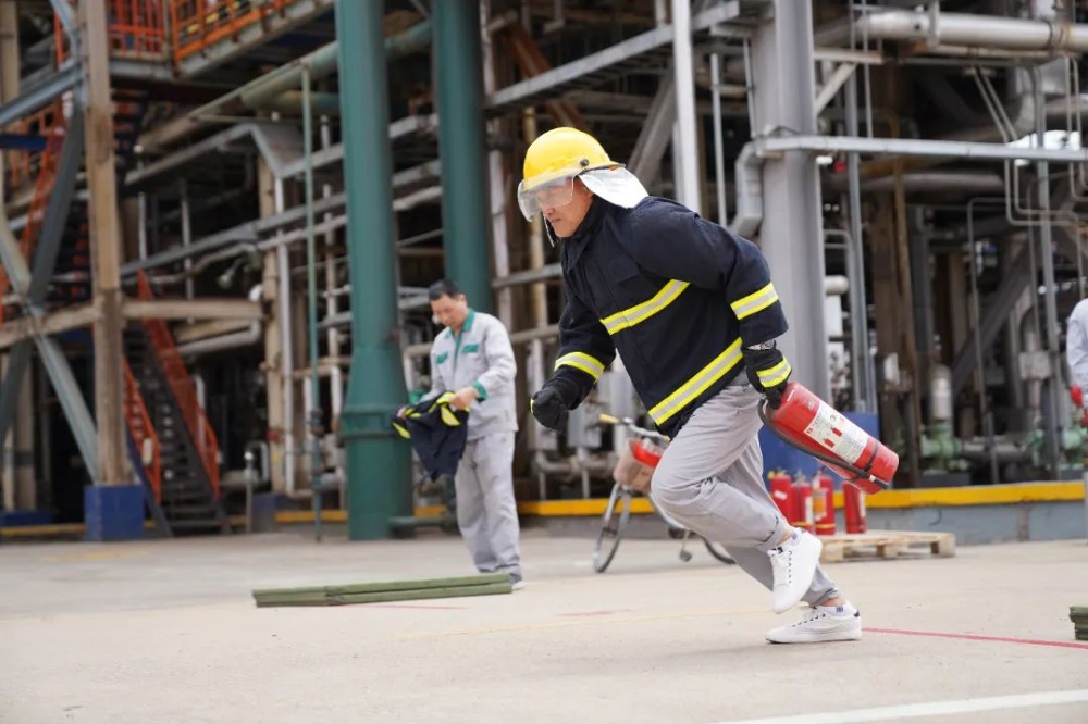 本次比武設HSE知識競賽、佩戴空呼器著防化服、油桶滅火、三人三帶接力出水擊靶等四個項目。